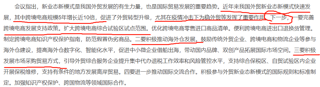 据新华网报,国务院总理李克强6月22日主持召开国务院常务会议,部署"十四五"时期推进大众创业、万众创新,激发市场活力。会议中,跨境电商成了亮点,多次被李克强总理点名!看来总理也看到了疫情期间,咱们跨境电商对于稳外贸功不可没!下一步,国家要继续完善跨境电商支持政策,扩大综合试验区试点范围(现在已经有105个了,可以预想到,核定征收的路子将会越铺越广)。二是要积极发展海外仓,未来大部分跨境电商企业都将
