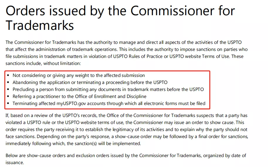 目前,美国商标局以"擅自冒用他人签字处理商标事务,提供虚假或欺诈性信息。"为由,对其进行制裁,并且展开一系列的商标活动调查。