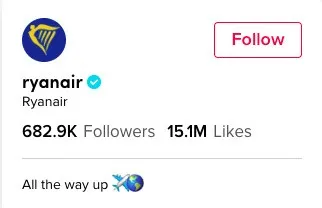 瑞安航空在 2020 年 5 月左右开设了TikTok帐户,截至目前收获了 13.9 万粉丝和超过240万个赞。他们发起的话题#ryanair,累计参与度已经达到9070万!