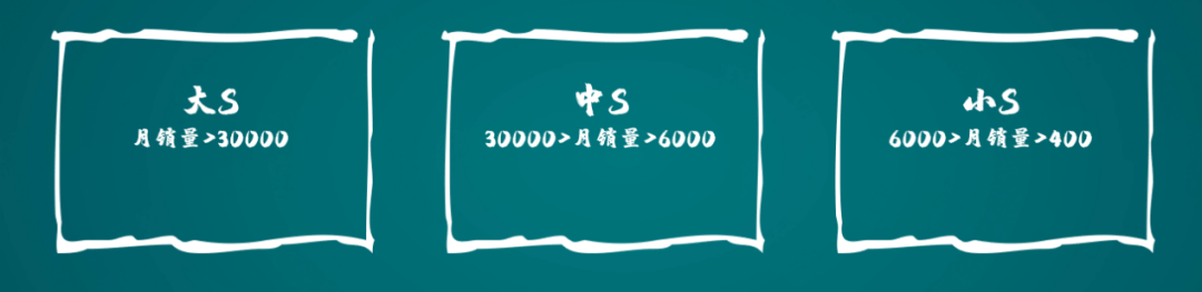 月销量在400-6000之间的产品,我们称为小S级产品;月销6000-30000,为中S;月销大于30000 ,为大S。