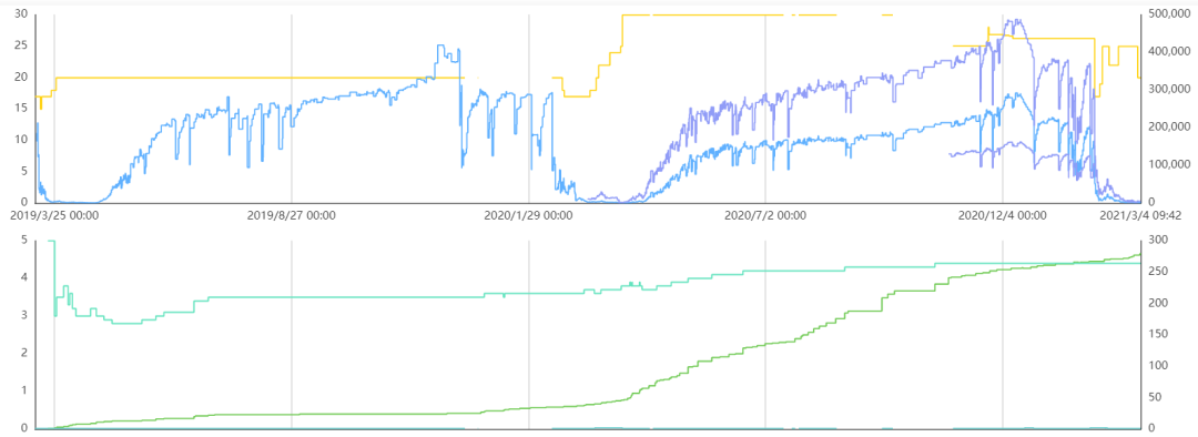 我们再来看竞品的趋势线,下图中的蓝紫线便是产品销量排名的变化,蓝色和紫色分别是不同大类的排名数据。需要注意的是,竞品趋势线中,并不是值越大销量越好。相反,排名越靠前,右边的纵坐标值就会越小,但销量却越大。