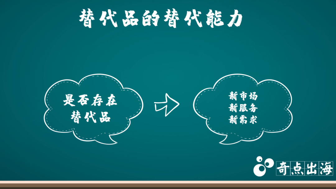 两个处于同行业或不同行业中的企业,可能会由于所生产的产品是互为替代品,从而在它们之间产生相互竞争行为,由于替代品生产者的进入,使得现有企业必须提高产品质量、或者通过降低成本来降低售价、或者使其产品具有特色,否则其销量与利润增长的目标就有可能受挫,所以我们在进行市场分析的时候,必须将替代品的威胁考虑进去,确认当前产品是否存在或有可能存在从新市场、新服务、新需求中催生的替代品。