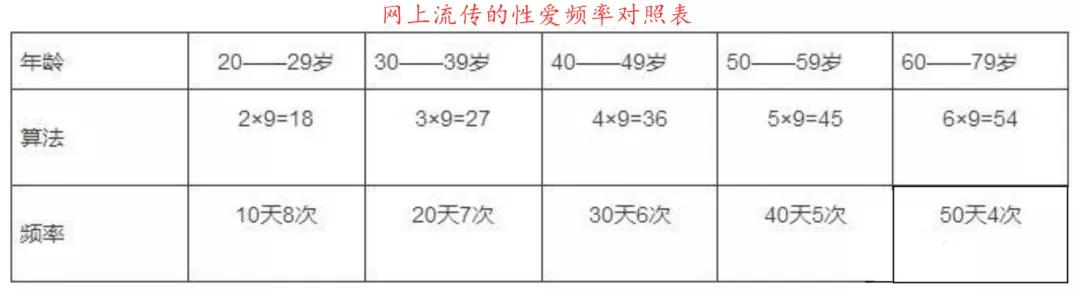 之前网络上还流传着一张"性爱九九法则表",可能你也看到过,他们说性爱频率 = 年龄的首位数 × 9,所得乘积的十位数为一个性爱周期所持续的天数,而个位则为合适的性爱频率。
