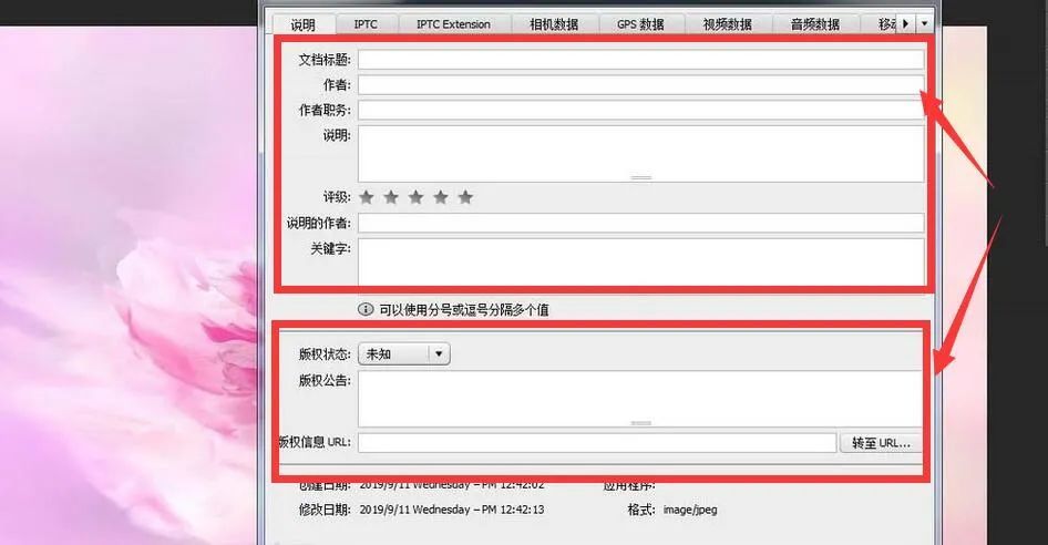 3、填写图片作者、URL、版权公告等基本的信息,别人在查看图片信息时就会显示出你所填写的内容。