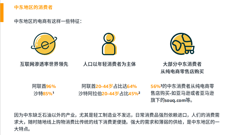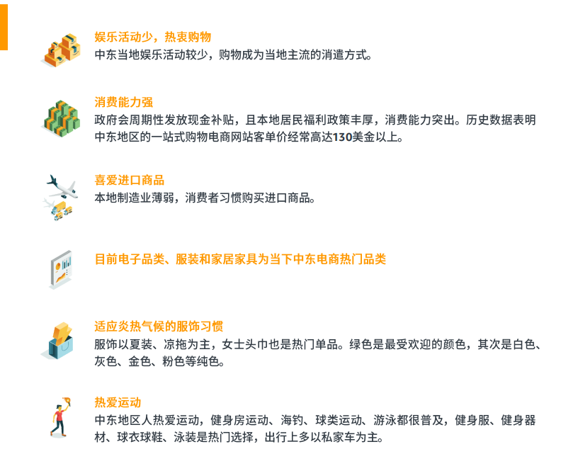 中东市场消费者"后浪"居多,男性偏多,多为穆斯林,基数庞大的年轻人口是电商的主要消费者。加上中东地区一年一半以上的时间为高温天气,电商可提供足不出户的购物体验。