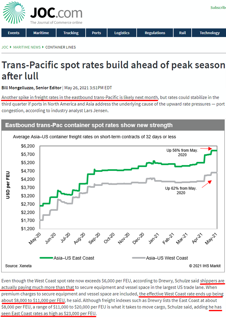 JOC是国际上比较权威的集装箱货运领域信息提供商,它出品的文章质量很高。这一篇详细分析了亚洲-美国航线的运价涨幅,非常适合发给买家参考。