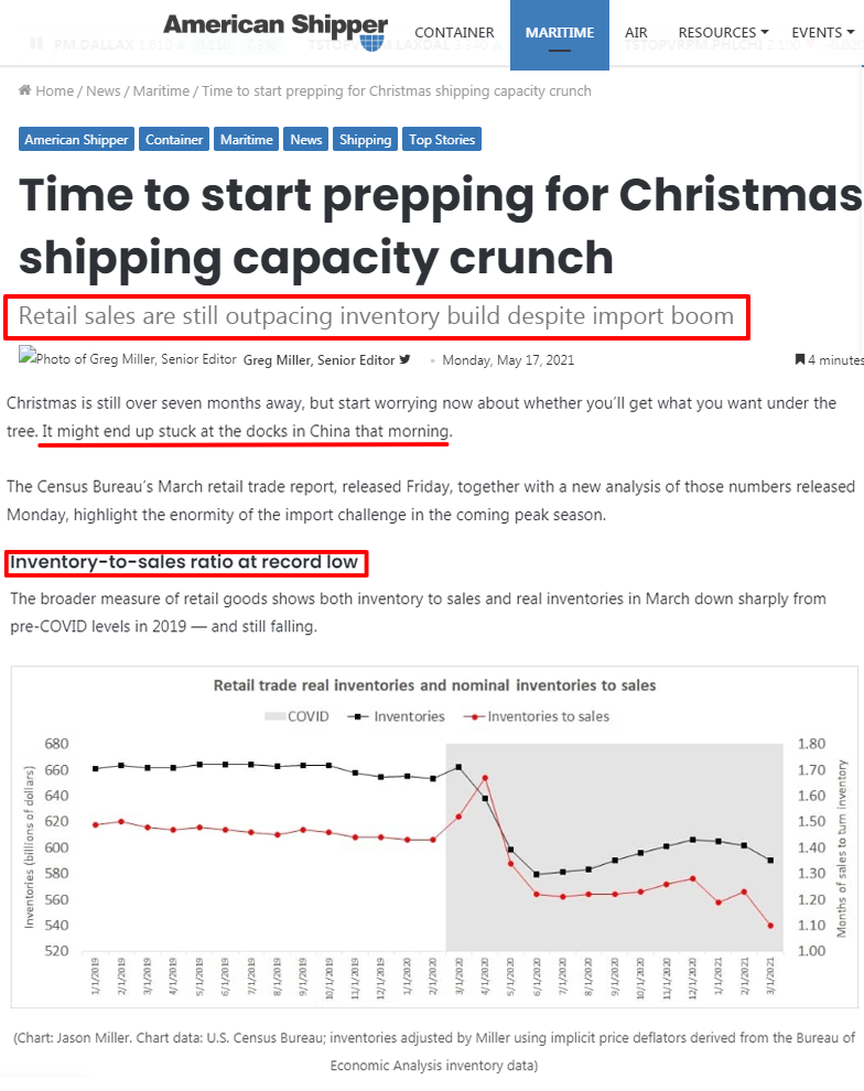 这篇文章非常适合发给美国客人看,它详细分析了美国零售市场的库存量和销售量的对比,显示出进货量赶不上库存量,虽然大家已经在疯狂进货了。文章说:"你也不想圣诞节时才发现自己的礼物还在中国港口吧!"
