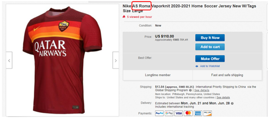 罗马足球俱乐部(A.S. Roma,简称罗马)位于意大利首都罗马。1927年7月22日,由罗马市当地的几家球队合并成立。1929年罗马首度征战意大利顶级足球联赛,曾3次荣获意甲冠军。在原告注册商标中,若卖家朋友在其产品描述中使用"AS Roma"一词,则可能构成侵权,如下面这位卖家: