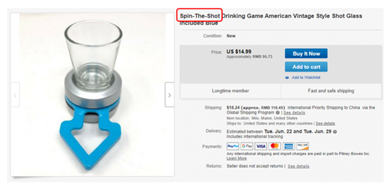 SPIN THE SHOT是一款酒桌转盘小玩具,只需将酒倒入所放的玻璃小杯中,旋转箭头,被箭头所指向的人就得必须喝!原告已注册了商标和版权,如果卖家朋友上架到网店的产品和SPIN THE SHOT相同或相似,或者在产品描述中使用了"SPIN THESHOT"商标词,则可能构成侵权,如下面这位卖家: