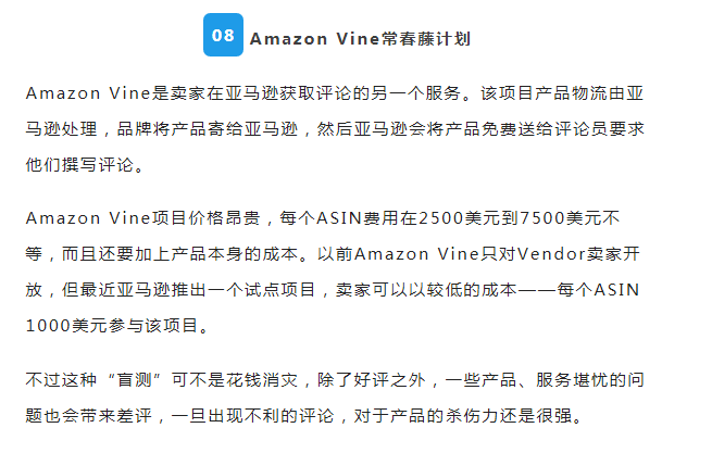 加入亚马逊"早期评论人计划"通过付费的方式来获取到有效的评价,但是卖家需要满足的条件是:a、只适用美国站b、产品的review数少于5条,产品单价超过15美元60美金一个项目,在卖家获取到5个review或是时间达到1年之后就会结束。