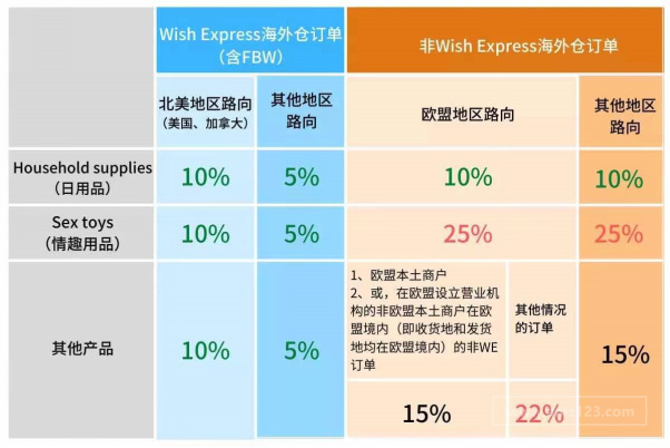 对于所有产品订单(包括日用品、情趣用品)的Wish Express海外仓订单(包括FBW订单)的收入分成都有下调: