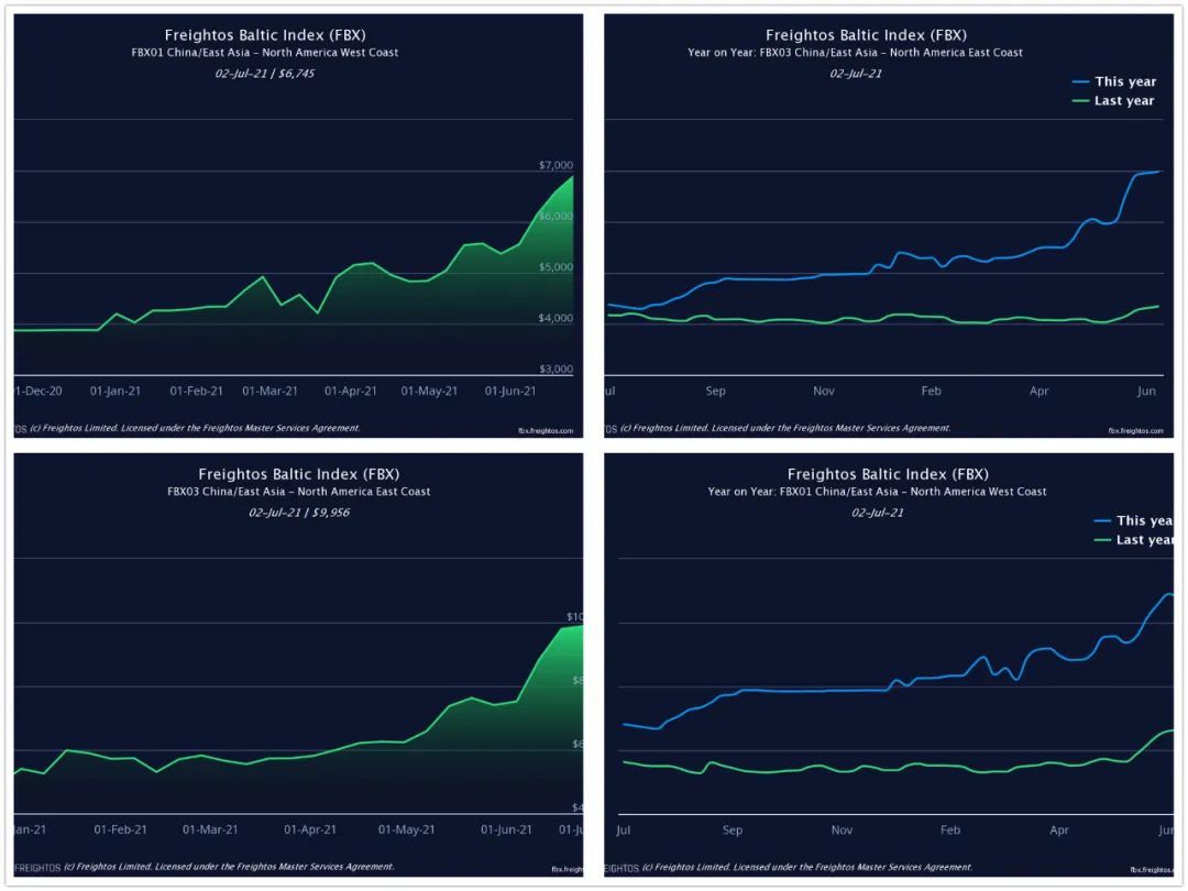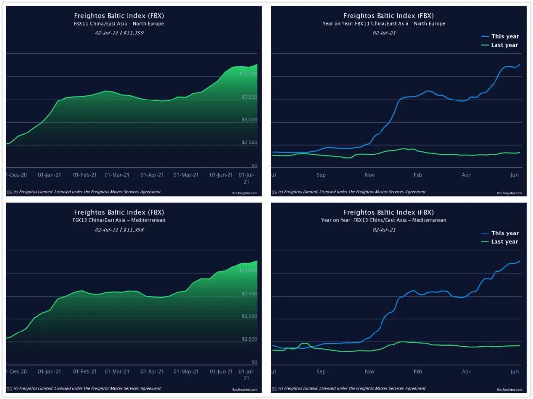 FBX-美东美西亚洲-欧洲航线:由于6月积压的货物,市场需求仍然旺盛;码头遇拥堵情况继续恶化,船期延误预计长达5-15天;欧洲/地中海市场需求强劲,舱位依然非常紧张,运价将持续上涨。