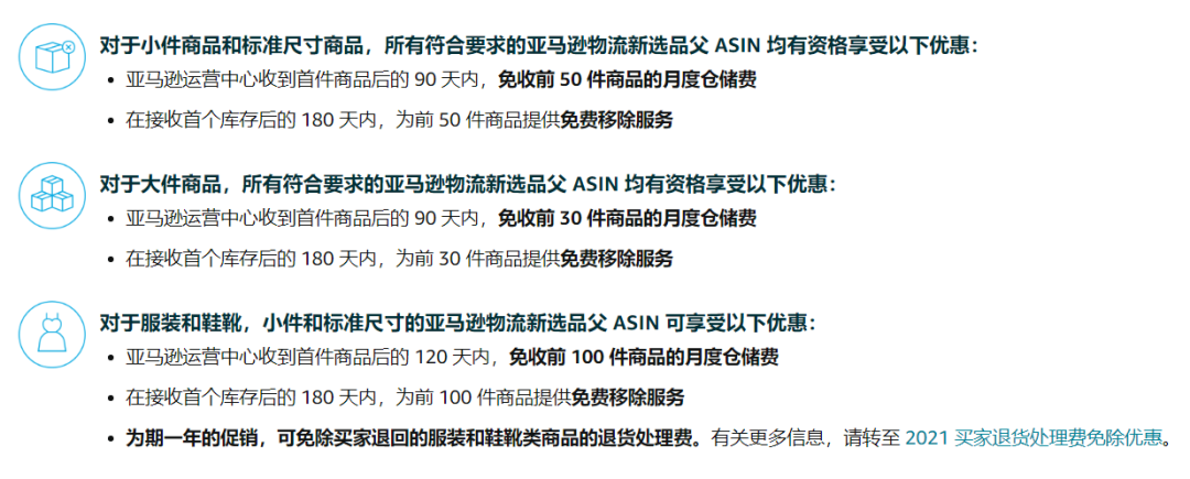 以及新 ASIN 限时提供免费仓储、免费移除和免费退货处理服务。