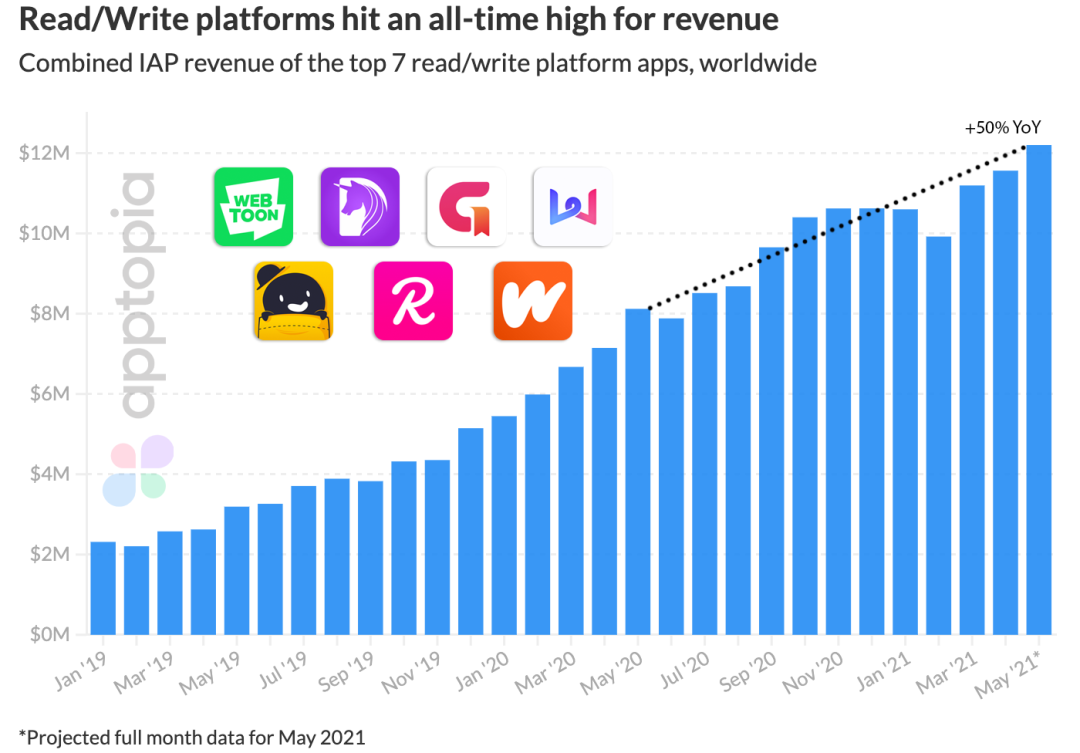 2020年在疫情的推动下,实现快速增长的不只有短视频、直播等赛道,网文出海,也极其亮眼。除了下载量和收入的增长以外,最明显的变化是开始出现差异化的探索,针对这一变化,白鲸出海在前不久发布的《加速买量、加推新品,2021年小说出海进入快速道》一文中也做了相关的报道。文/pridecheung数据来源:Apptopia近两年,网文/漫画App的内购收入快速增长而这种整体的增长,也引来了巨头入局,7月1