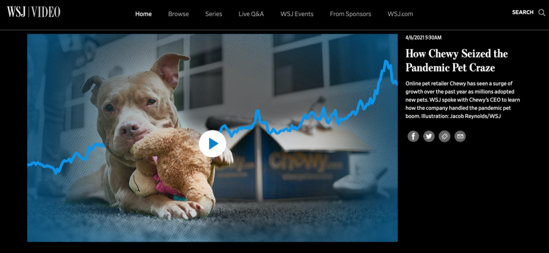 无独有偶,华尔街日报也做了一个特别专题,宠物电商巨头Chewy,把握住了疫情期间宠物用品疯狂增长的机会。