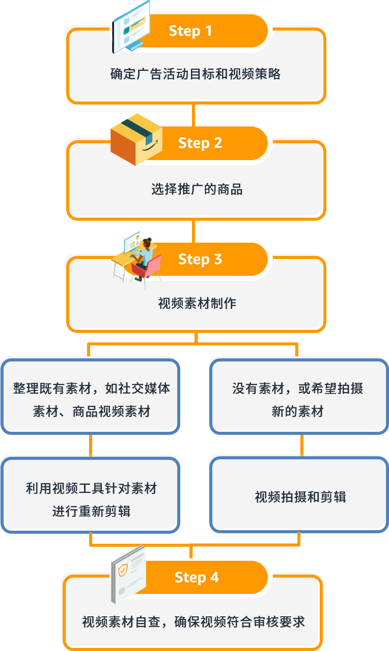 无需高昂的预算和专业团队,亚马逊广告带你解锁制作高效品牌推广视频素材的秘诀!文末还有彩蛋等你打开!品牌推广视频的准备步骤视频素材的制作是决定品牌推广视频广告活动至关重要的一环,您可以根据品牌具体的情况来决定具体的素材制作步骤。广告目标与视频策略品牌推广视频与其他广告产品一样,想要实现绩效,首先要明确目标,以便根据广告活动中的变量进行有针对性的设置。对于品牌推广视频来说,重中之重则是视频素材。与一般