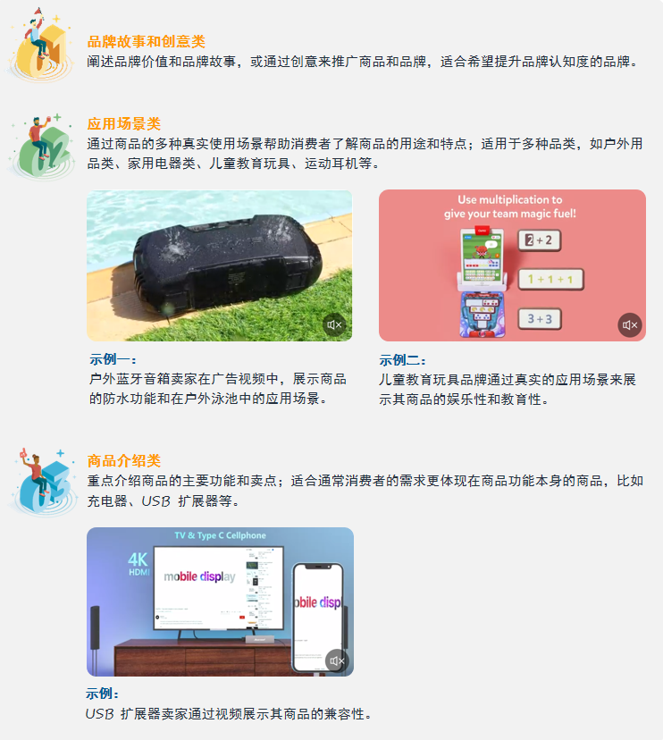 亚马逊广告总结了四种常见的视频素材类型,帮助您了解各个类型的功能和呈现方式,以便您根据广告目标以及要推广的商品类目进行规划。