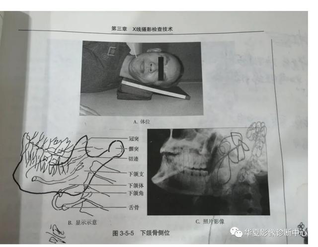 3. 下颌骨侧位(被检者仰卧摄影床,颈部前伸,下颌仰起,使下颌体与IP板下缘平行,被检侧肩部向下牵拉,前臂伸直置于身旁,健侧身体垫高,下肢屈曲固定身体。中心线:向头侧倾斜25°,经被检侧下颌骨中点射入)。