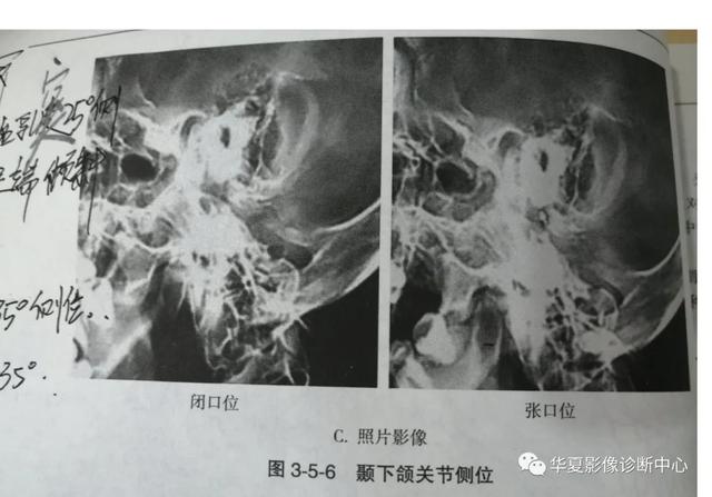 4. 颞下颌关节侧位(被检者与头侧位相同。被检侧颞下颌关节对准IP中心,先摄闭口位,保持头不动,再摄张口位,摄完一侧再摄另一侧。中心线:向足侧倾斜25°,对准对侧外耳孔上7CM,经颞下颌关节射入)。