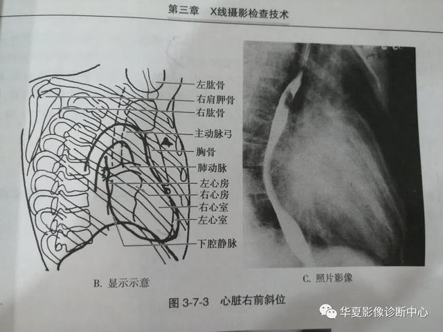 3. 心脏右前斜位(被检者立于摄影架前,面向摄影架,右前胸壁紧贴摄影架,使身体冠状面与摄影架呈45°角,左臂上举,屈轴抱头,右手背放于髋部,右臂内旋,上缘超出锁骨6CM,下缘达第12胸椎,左前及右后胸壁包括在内。中心线经第6胸椎水平与左侧腋后线交界处射入)。