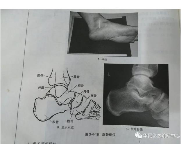4. 跟骨轴位(被检者坐于摄影台,被检侧下肢伸直,足尖向上,稍内旋,踝关节极度弯曲,可用布带拉扯足前部。中心线:向头端倾斜35°-45°,经内外踝连线中点摄入射入IP板)。