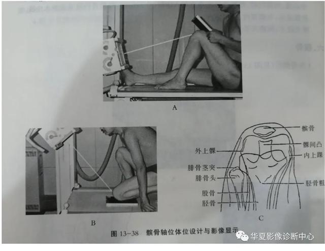 12.髌骨轴位(被检者坐于摄影台,患者膝关节极度屈曲,IP板置于股骨下端的前方。或者患者轻跪IP板,股骨尽量向后。中心线:经髌骨下缘向上缘方向投射,后者经髌骨上缘向下缘方向投射)。
