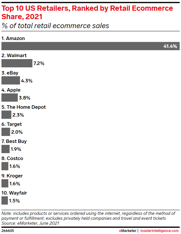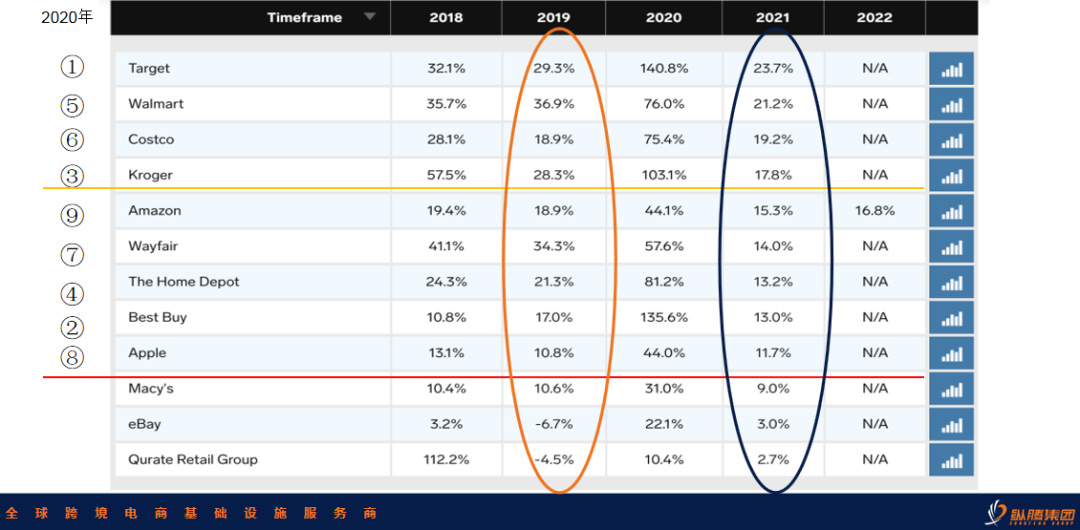 可以注意到的是,增速大涨的Top10电商平台诸如Target、Kroger、Best Buy、Costco,在2020年销售额翻了一倍多后,今年增速都有所滑落,部分甚至不敌2019年的水平(如图一)。所以美国电商市场发展最受益的,恐怕是这些线下连锁零售企业。