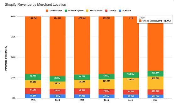 谈及电商平台之争,就不得不提到2020年的新锐——Shopify,除了销售额超过EBAY,增速和市场热度无人能敌,在多个地区也都取得了亮眼的业绩。