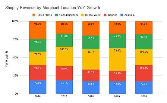 美国地区是Shopify最重要的收入驱动力(占 2020 财年收入的 66.7%,如图三),但美国地区的增长在疫情前就已呈现下降趋势(如图四),其他地区的增速都有持续赶超的势头。