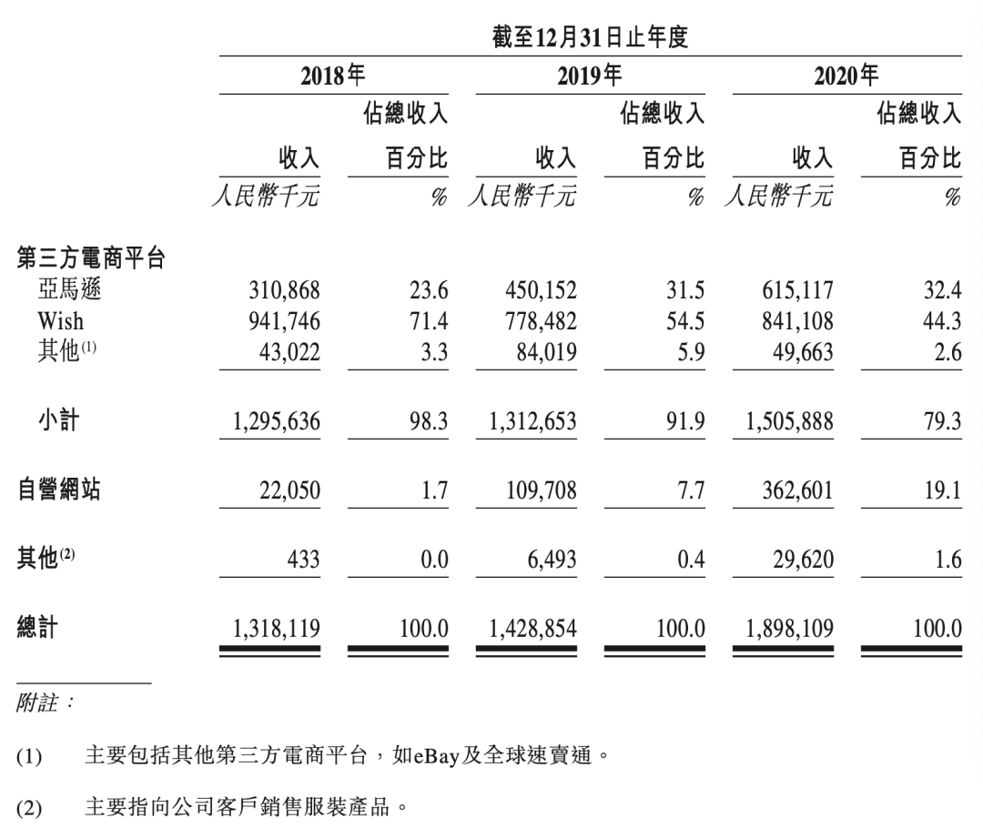 从销售渠道比重来看,子不语透过亚马逊及Wish销售产生的收益分别约为人民币12.53亿元、12.29亿元及14.56亿元,分别约占当年总收益的95.0%、86.0%及76.7%。在可预见的未来,子不语通过亚马逊及Wish进行的销售将继续占其总收益的绝大部分。