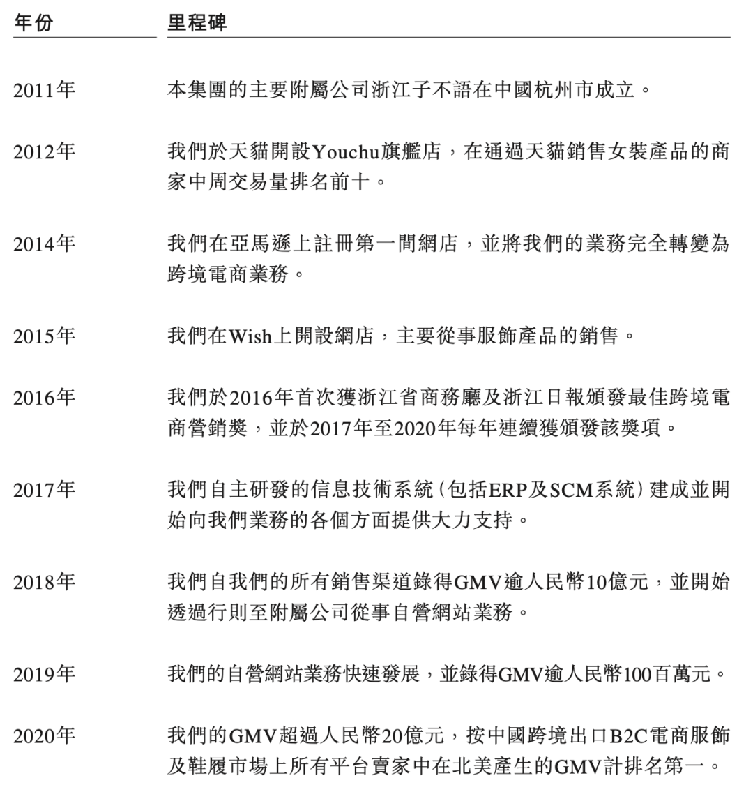 2018年,子不语所有销售渠道录得GMV超过人民币10亿元。同年,公司在开曼群岛注册成立为获豁免有限公司,初始法定股本为50,000美元,分为5,000,000股每股面值0.01美元的股份。