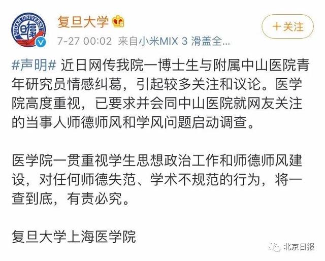 7月27日凌晨,@复旦大学 发微博回应此事:已要求并会同中山医院就网友关注的当事人师德师风和学风问题启动调查,将一查到底,有责必究。
