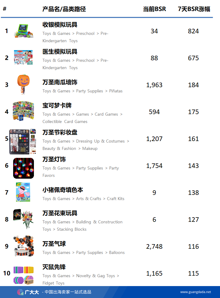 以下榜单通过广大大电商分析亚马逊选品数据板块,综合比对FBA商品价格、预估月销量、BSR排名、近7日BSR涨幅、评论趋势、上架时间等数据,并去除重复度较高的商品得出。近期,随着万圣节的临近,用户已经开始购买万圣节商品,因此大量万圣节相关玩具商品纷纷上架,并且其中不乏增势迅猛的商品。在近7日亚马逊美国站玩具品类飙升榜单中,万圣相关商品占据半壁江山,其中二级类目PartySupplies商品占据多数原