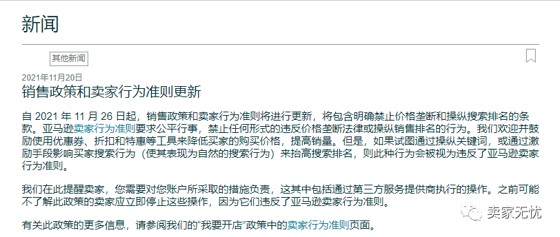 前两天,亚马逊在新闻版块发布了《销售政策和卖家行为准则更新》