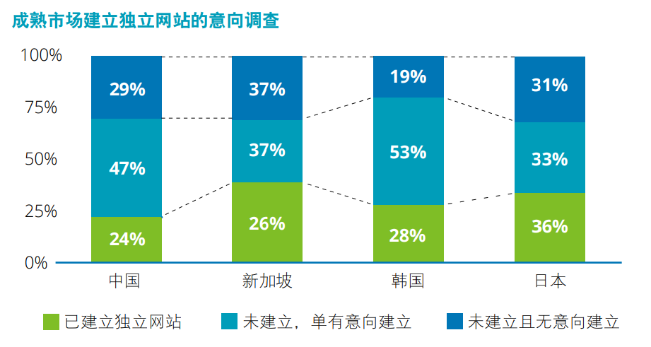 德勤 12 月发布的《科技赋能下的亚太数字贸易》报告对部分国家市场的跨境卖家建立独立站的意向做了一项调查,结果显示,24% 的中国卖家已经搭建独立站,47% 的卖家未建站但有意向,几乎是前者的 2 倍。