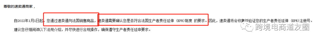 ▲ 12月16日,速卖通平台发布了关于法国境内回收义务至卖家的公告:自2022年1月1日起,您通过速卖通向法国销售商品,速卖通需要确认您是否符合法国生产者责任延伸(EPR)制度的要求。因此,速卖通将会收集并验证您的生产者责任延伸(EPR)注册号。