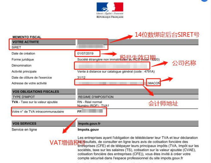 法国税号文件上会有SIRET 号、税号生效日期、客户公司名称、VAT 增值税号、会计师的公司地址及所在税局等信息,如下图所示:注意:需提供税号文件与近三个月的税局回执,并告知转代理后需从几月份开始申报。