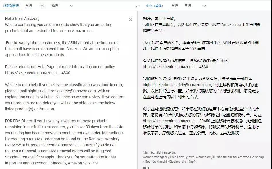 首先,非常遗憾地告诉链接变狗的卖家,该类下架很难申诉回来,因为亚马逊明文禁止销售。而且,根据已经变狗的卖家收到的回复,亚马逊正在实施锂离子电池的上架限制,这个新限制似乎比以往的更加严厉。此次中招的卖家主要集中在加拿大站点,也有部分美国、欧洲站卖家出现链接被批量下架的问题。