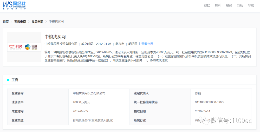 网经社企业库(COP.100EC.CN)显示,中粮我买网隶属于中粮我买网投资有限公司,该公司成立于2012年4月5日,法定代表人为陈朗。中粮我买网创办于2009年,该平台称是中国最早专业化食品电商平台,也是中粮集团品牌战略总出口。我买网依托中粮集团在全球的产业链布局,将海内外健康、美味、便捷、愉悦的食品和贴心的服务奉献给用户,以"中粮制造+中粮优选"服务新兴中产阶级家庭。