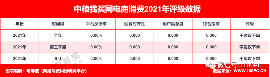 今天发布的是"中粮我买网"电诉宝消费评级数据。据"电诉宝"显示,2021年"中粮我买网"共获得3次消费评级,均获"不建议下单"评级,2021年最终获"不建议下单"评级。
