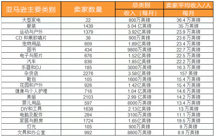 从数据来看,亚马逊卖大型电器类别的卖家月均收入最高,达到364000英镑(约313万人民币)。此外,书籍、CD和黑胶唱片也是卖家最赚钱的类别之一,月收入分别为227000英镑、234000英镑。