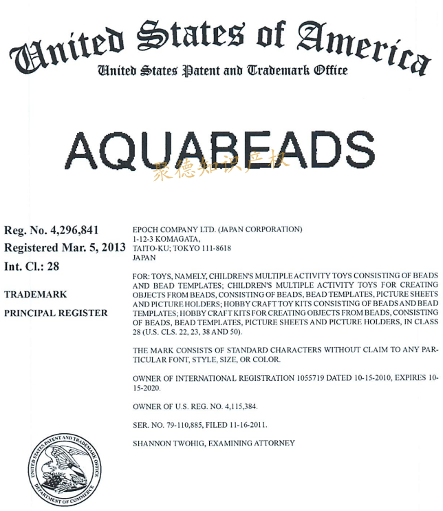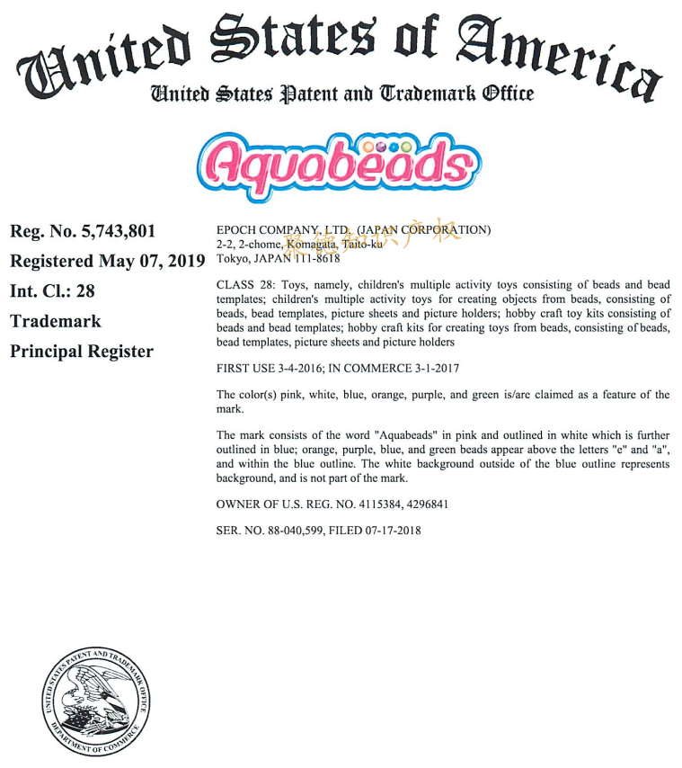 Epoch Company, Ltd.经常维权的商标是AQUABEADS,这个文字商标在2013年成功注册的,商标主要布局在28类。