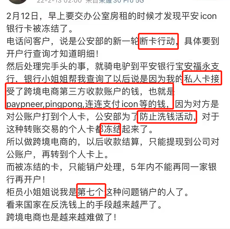 2月13日,据一位Shopee卖家在微博上爆料,其一张平安icon银行卡莫名遭到冻结,经银行工作人员的查询,原因系其私人卡接收了来自跨境电商第三方收款账户的资金汇入,即Payoneer、Pingpong、连连支付icon等跨境收款平台。
