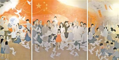 一些作品采用全景视角,表现充满活力的全面小康社会。比如,管建新和管建林创作的油画《民生建设——暖心千万家》,采用三联画的构图:右侧通过描绘不同年龄段的儿童,表现幼有所育;左侧通过勾勒当代青年人的工作和生活,彰显国家发展的青春朝气;中间画面则通过刻画老人丰富多彩的晚年生活,体现老有所养、老有所乐。整幅作品记录下民生建设中的暖心变化,也反映出百姓幸福指数的持续上涨。