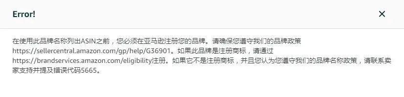 亚马逊必须先批准您的品牌,然后您才能使用该品牌发布商品。您应该通过亚马逊品牌注册注册品牌,但如果您的品牌不符合亚马逊品牌注册要求,则可以通过联系销售伙伴支持并提供错误代码 5665 来获取异常信息。