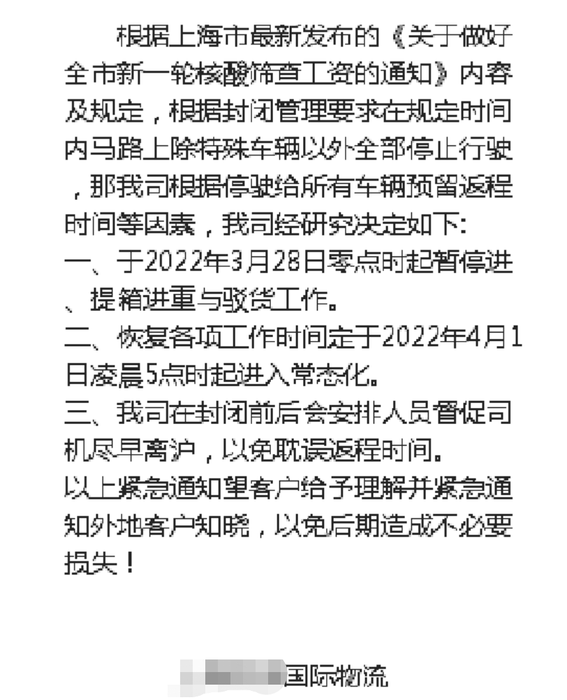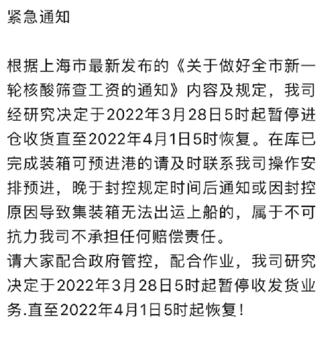 很多货代发布暂停进仓收货直至2022年4月1日5时恢复,部分因为封控规定导致集装箱无法出运上船的通知。