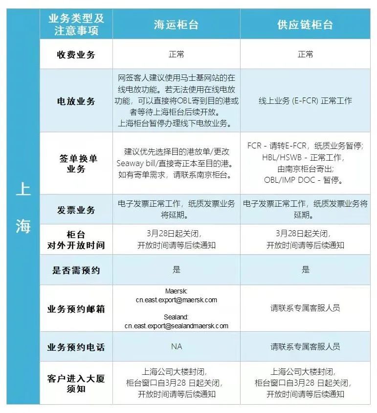 尊敬的客户:根据上海及周边地区新冠肺炎疫情防控需要,中远海运集运上海及周边各服务机构(包括:上海地区、无锡经营片区、苏皖经营片区、苏州经营片区、苏北经营片区和浙北经营片区)均已采用远程办公方式,在疫情管控期间,将持续为客户提供稳定可靠的服务,以下具体安排敬请知悉: