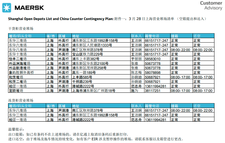 上海部分仓库自3月28日起关闭,直至另行通知。本公告附有一份开放仓库清单,以安排进提空箱和还箱。