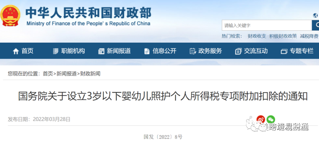 3月28日,财政部网站发布《国务院关于设立3岁以下婴幼儿照护个人所得税专项附加扣除的通知》(以下简称《通知》)。
