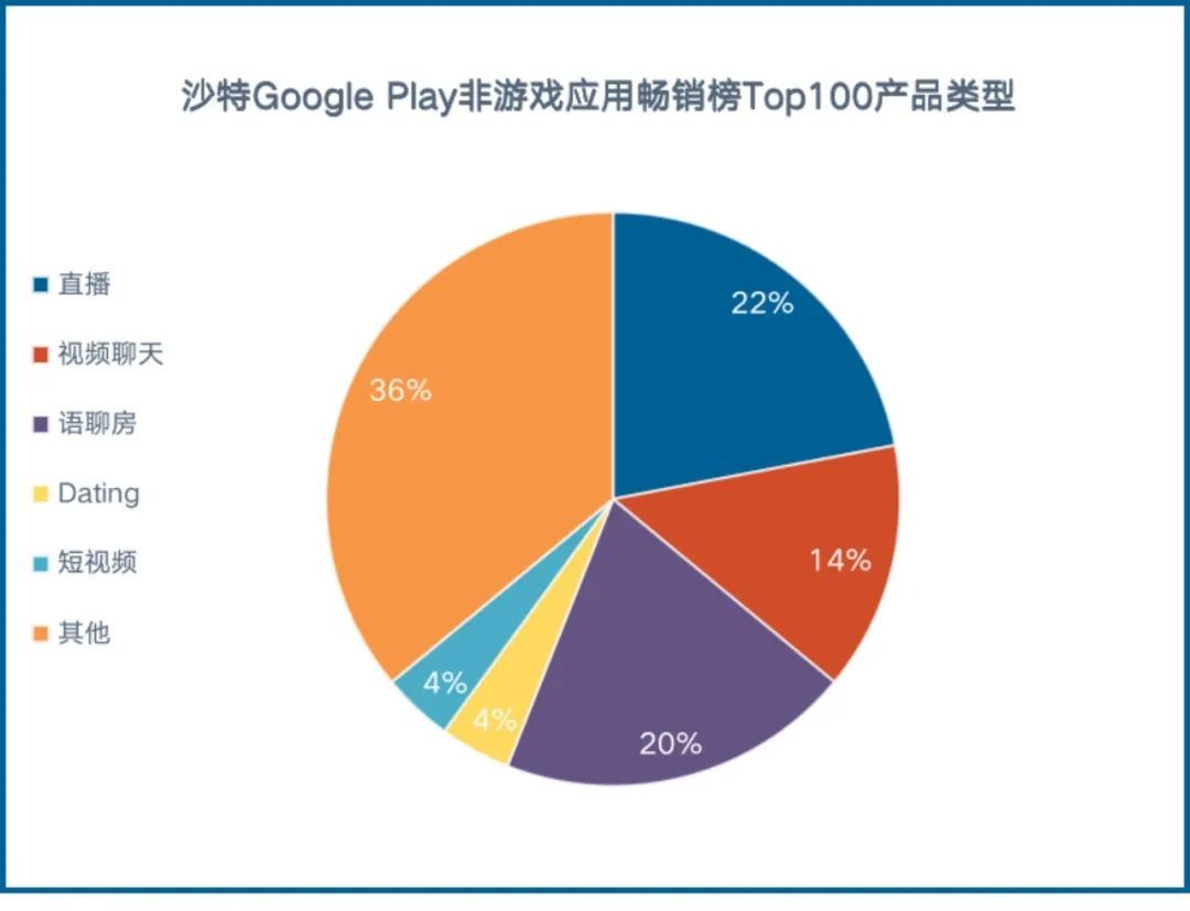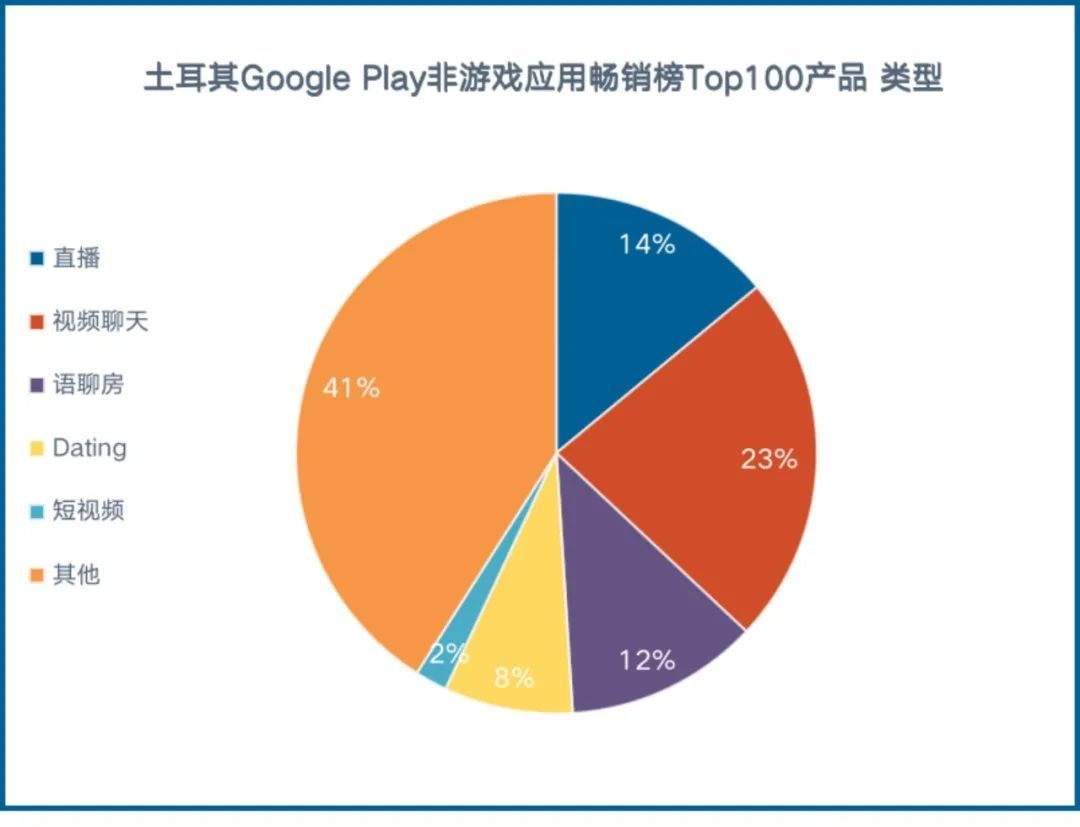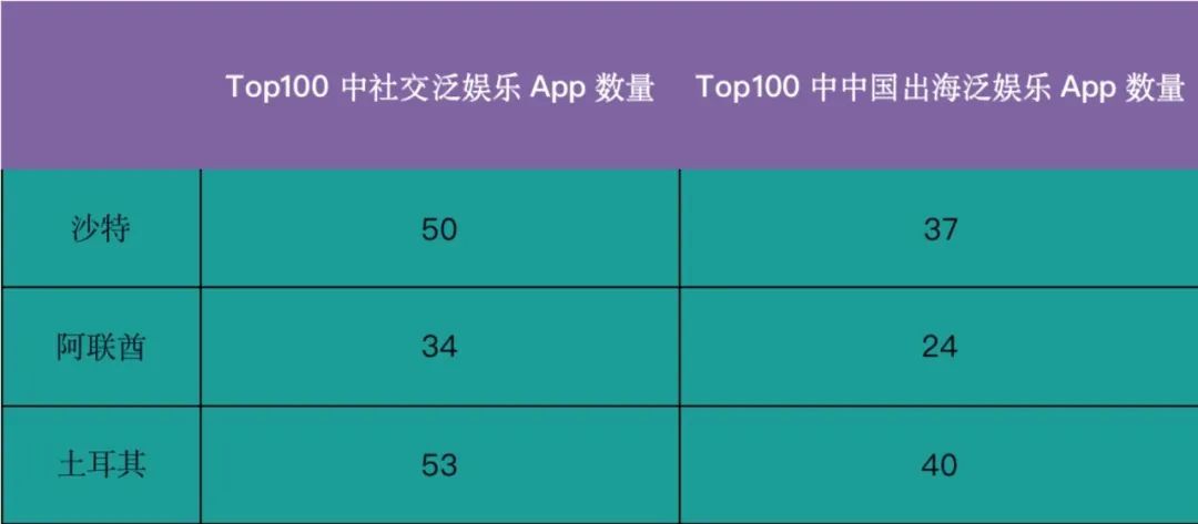 从产品类型来看,沙特 Google Play 畅销榜 Top100 中有 50 款社交泛娱乐 App,占到了统计总数的 2 分之 1,土耳其市场甚至更多;而阿联酋市场虽然略少于沙特,但也占到了总数的 3 分之 1。